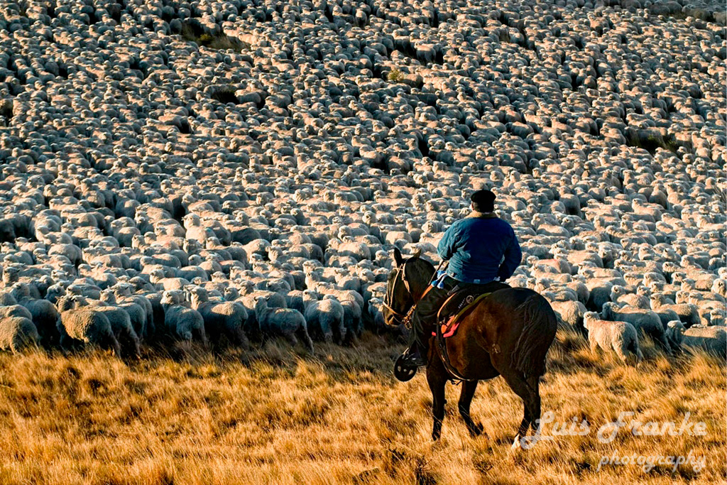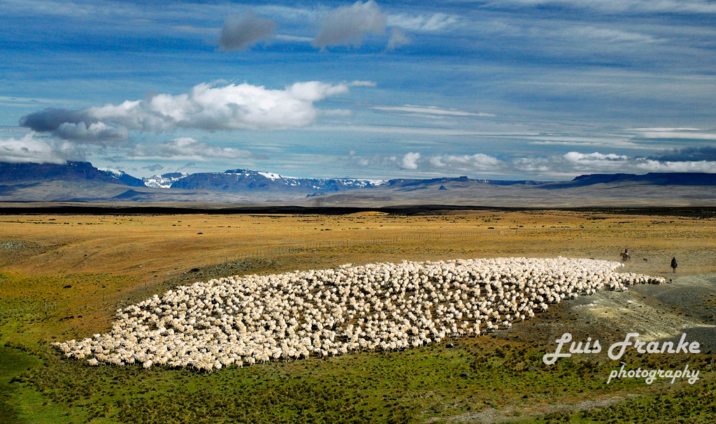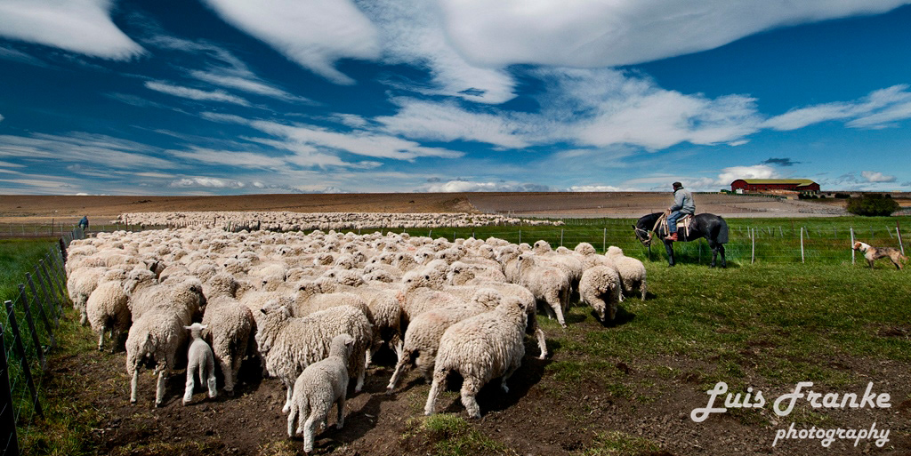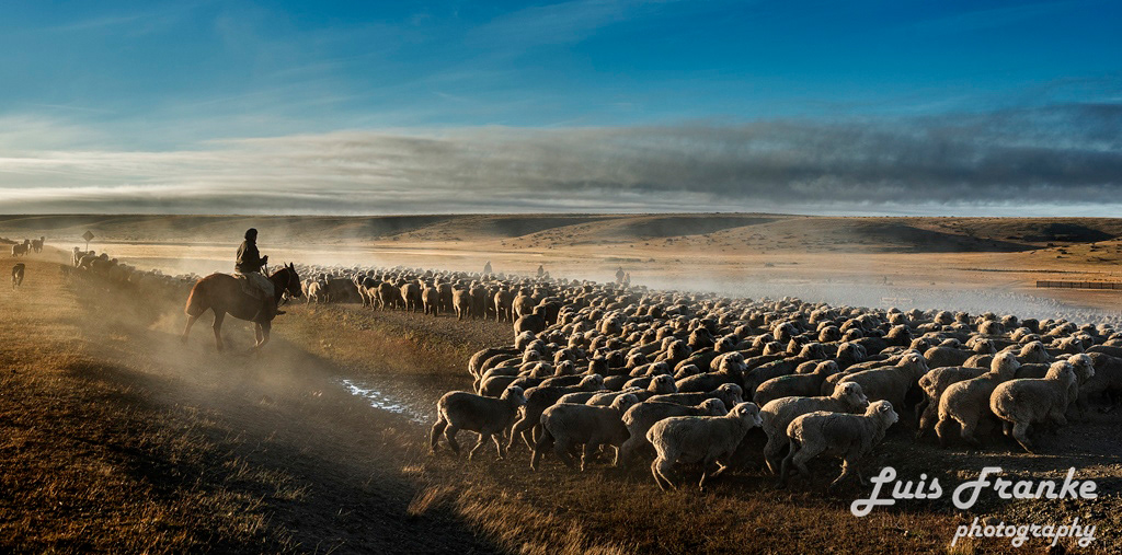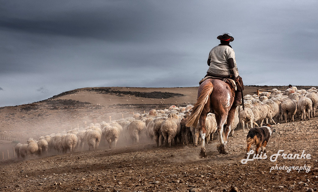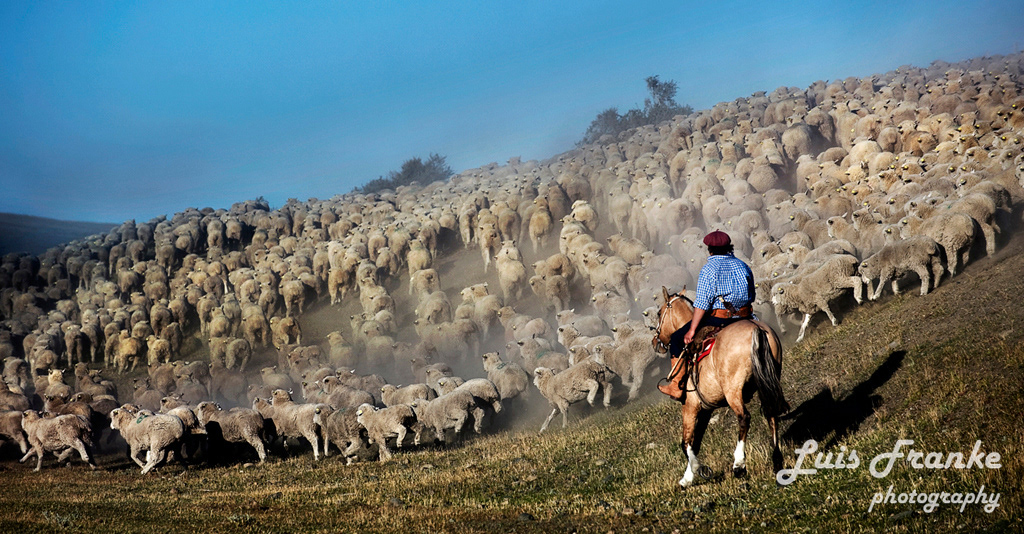 Los arreos de ovejas son parte de la vida del gaucho patagónico. Pueden ser muchas horas arriba de sus caballos arreando miles de ovejas ayudados por sus fieles perros.